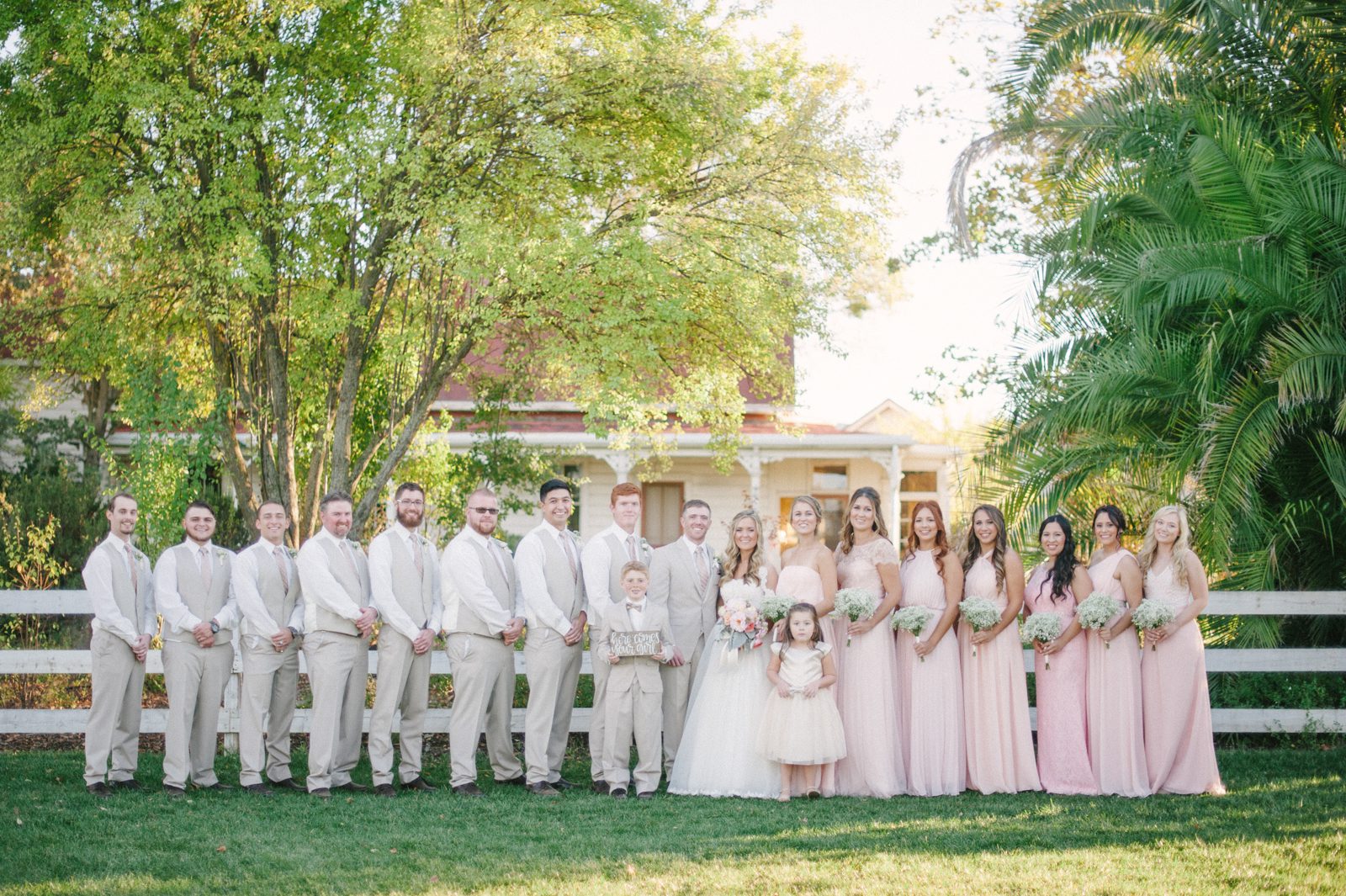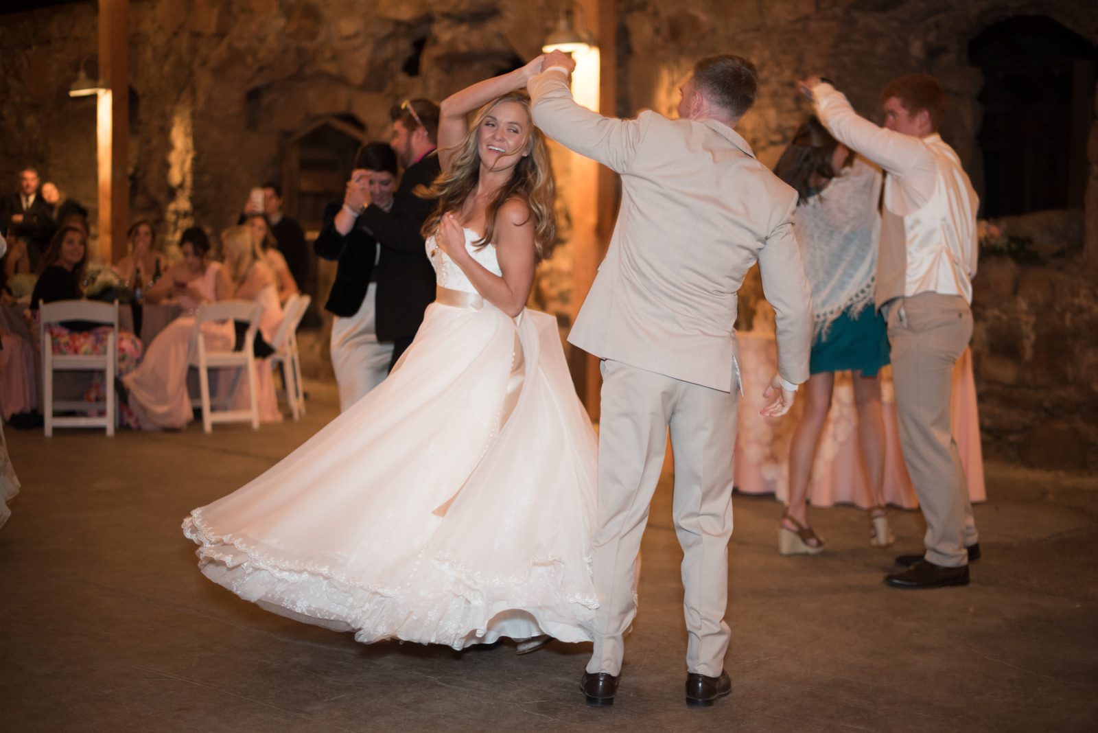 Chris and Aubrey’s wedding was perfect for this beautiful location. Aubrey’s dress was fit for a princess! However, she stayed true to her country roots by rocking a pair of cowboy boots! Chris and his groomsmen’s khaki suits and the bridesmaids pink gowns complimented the scenery so perfectly. Their wedding was traditional, but with a country twist! The ceremony took place on a grassy lawn under a huge oak tree in front of their family and friends.